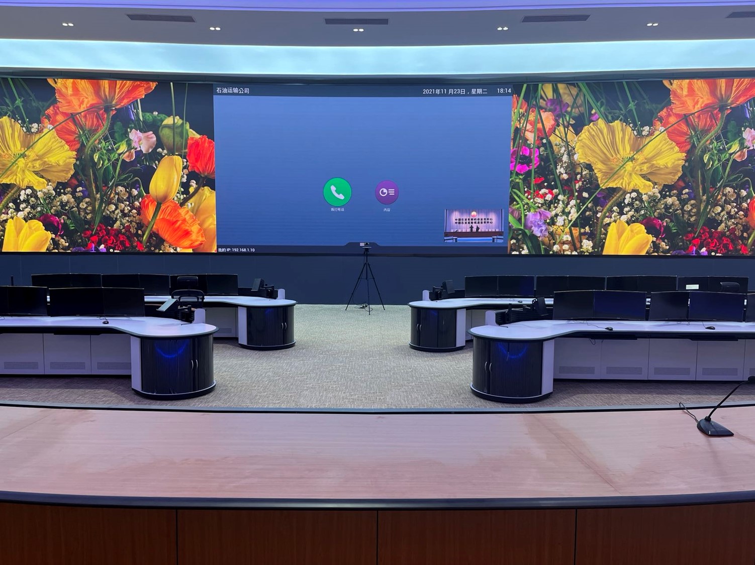 中國石油運輸公司調度中心項目位于北京順義和新疆烏魯木齊兩地,兩地調度中心各建1套1.56mm的LED監(jiān)控大屏,并重點對兩地視頻會議功能進行升級,由原來模擬視頻會議終端升級為高清終端,實現雙路高清攝像機信號的實時切換及雙流顯示。保證兩地調度中心會場互聯(lián)互通,實現視頻交流,通過集團M